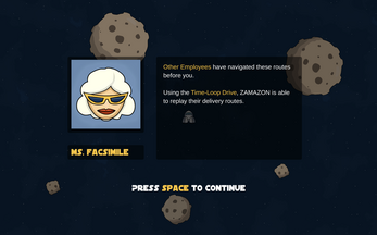 Recently "employed" by the sinister ZAMAZON corporation, you find yourself trapped in an endless time loop with horrific implications. Not even death can stand in the way of optimized delivery times!